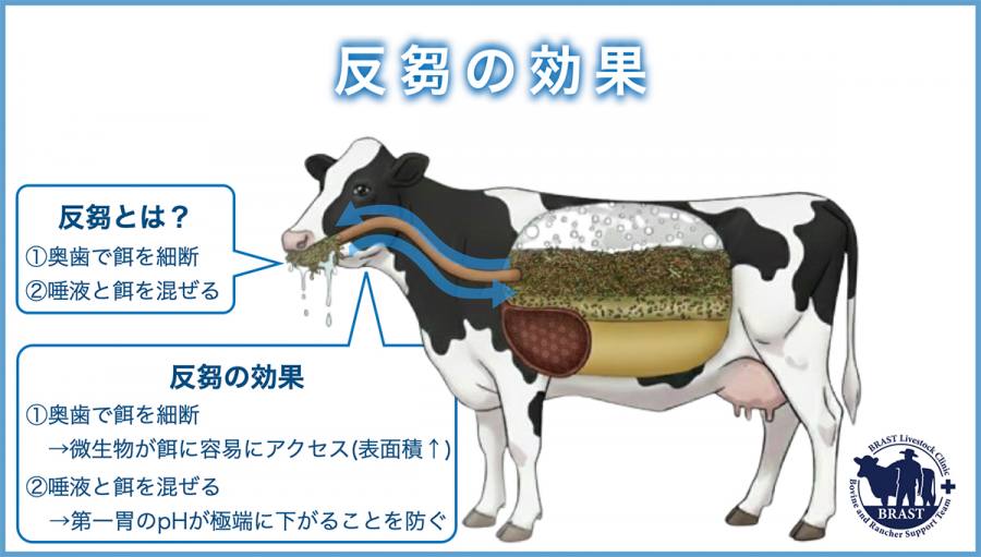 牛の反芻は第一胃で餌が胃壁をチクチクと刺激することでスイッチが入ります。これはルーメンマットをいかに形成していくかということにもつながります。