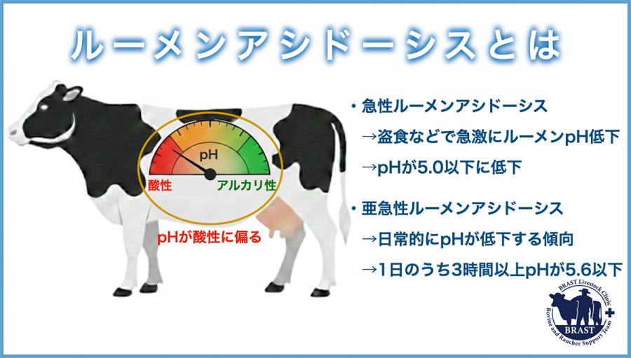 ルーメンアシドーシスとは、第一胃内のpH(以下、ルーメンpH)が酸性に偏ることを意味し、以下の2つのパターンが課題とされます。