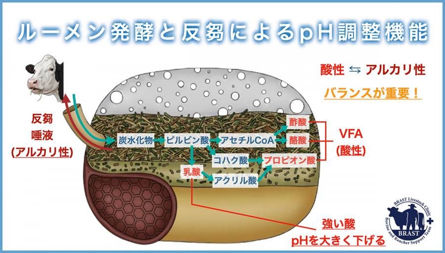 つまり、牛がルーメンで餌を発酵させ、エネルギーを取り出す際には必ずpHを酸性側に傾けてしまうのです。