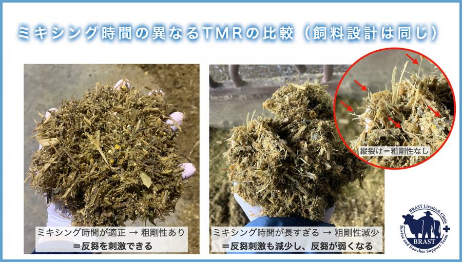 ①も②も飼料設計や給餌方法により起こりうる課題ですが、おそらく飼料設計が原因のルーメンアシドーシスは減ってきているのではないでしょうか。現場でよく目にするのは②で、その原因としてはミキシング時間が長すぎることでゴツゴツした繊維が減少 → 反芻も減少することに起因しています(=ふにゃふにゃした繊維では反芻を刺激できない)。