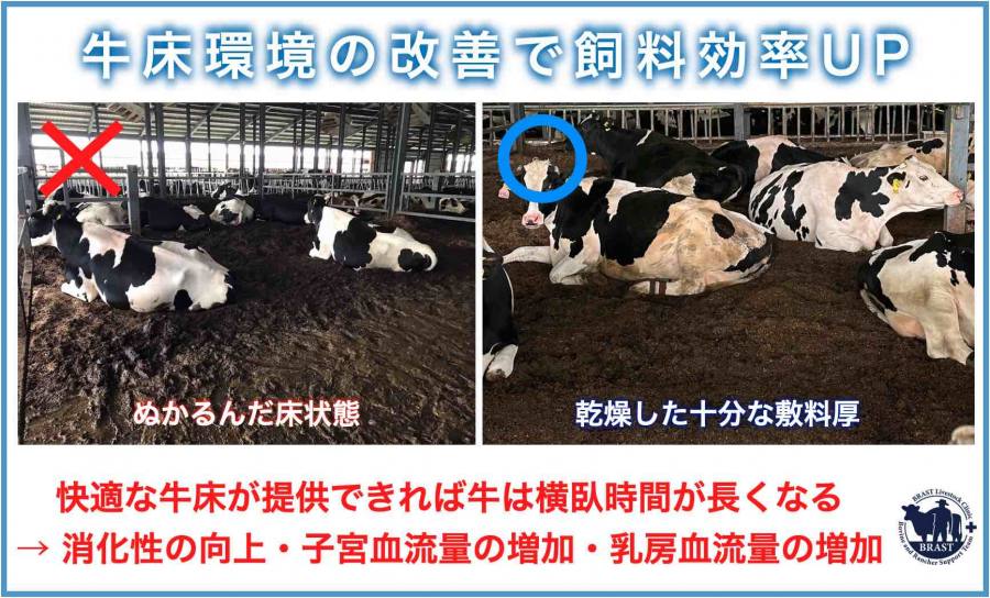 飼料価格が高くなっている今、牛床環境を改善することで飼料効率が上がればこれまでよりも少ない飼料で栄養充足できる可能性もあります。改めて飼養管理の大切さを実感した事例でした。
