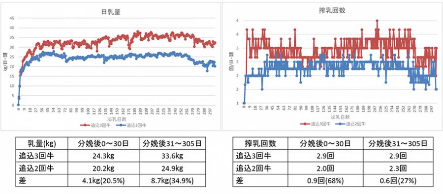 過去の報告では、分娩後301日までの乳量比較で、3回搾乳をした牛は2回搾乳をした牛より、経産牛は18.5%、初産牛は25.2%の乳量増加が認められています(H.E.Amosら、1985)。